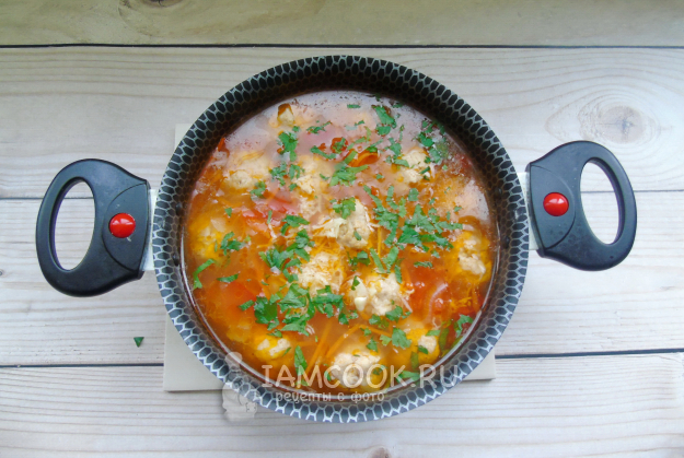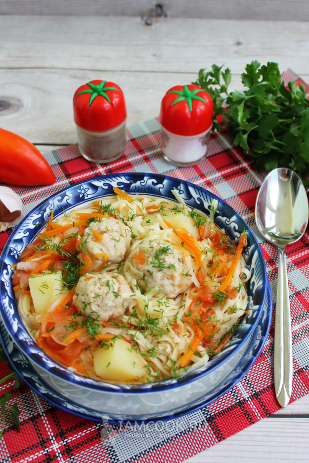Сверху налейте бульон с фрикадельками и овощами. Лагман с фрикадельками готов.