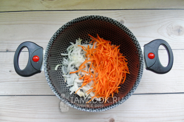 Репчатый лук нарежьте полукольцами, а морковь - соломкой. Выложите в казан или кастрюлю с толстым дном и налейте подсолнечное масло.