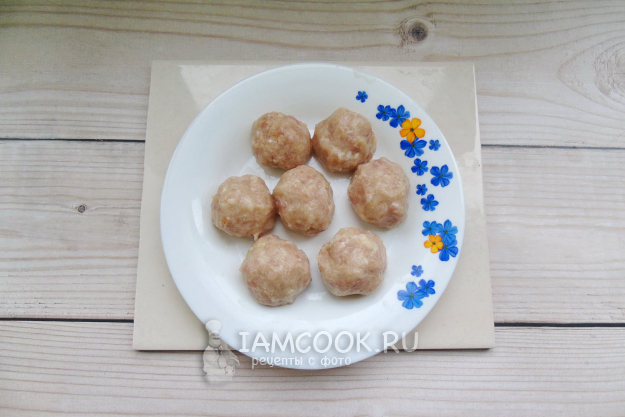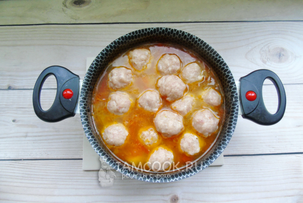 Доведите до кипения и выложите в кастрюлю фрикадельки.