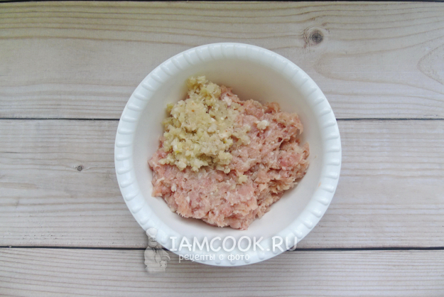 В мясной фарш добавьте репчатый лук, измельченный любым способом. Посолите, поперчите и перемешайте.