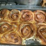 Острым ножом нарежьте рулет на кусочки шириной 2,5-3 сантиметра. Выложите заготовки булочек в сковороду или любую форму для выпечки с пекарской бумагой.
