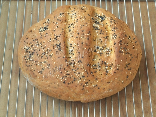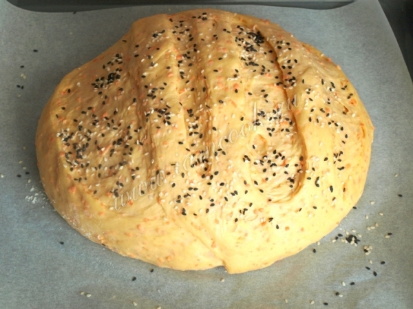 Поднявшийся хлеб сбрызнуть водой, посыпать кунжутом.