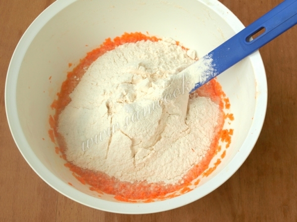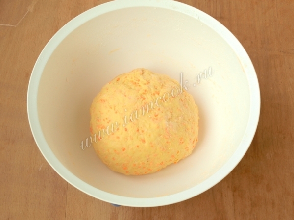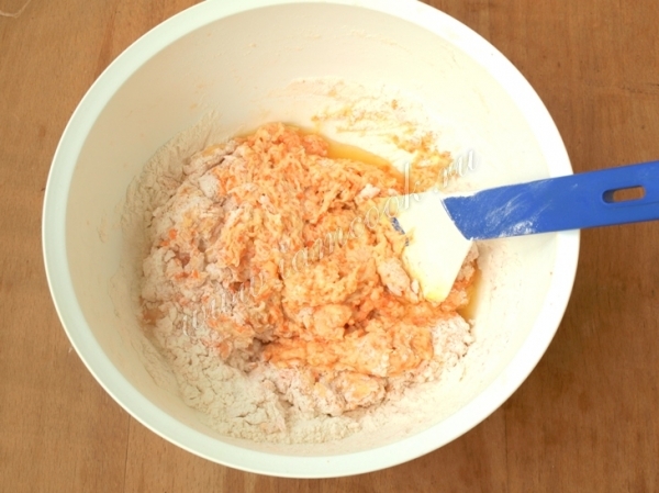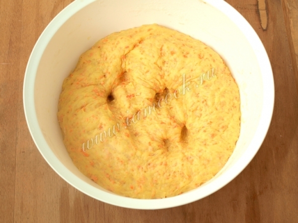 К поднявшимся дрожжам добавить яйцо и натёртую морковь, хорошо перемешать.