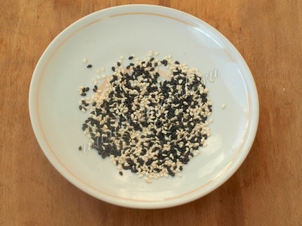 Смешать белый и чёрный кунжут. Это по желанию. В принципе можно просто посыпать хлеб какой-нибудь травкой.