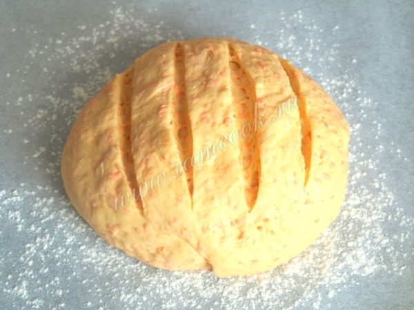 Противень застелить бумагой для выпечки или положить силиконовый коврик,присыпать мукой. Сформировать из теста буханку, выложить и по верху сделать надрезы. Оставить хлеб на расстойку на 20 минут прикрыв полотенцем.