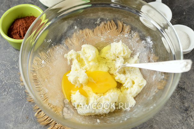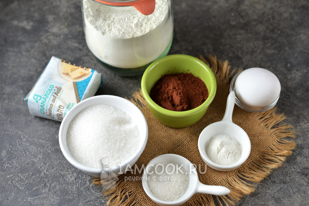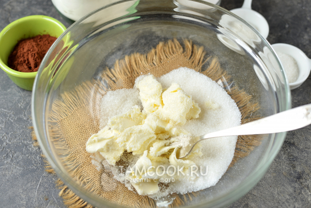 Подготовьте все продукты для шоколадного печенья с трещинками. Сливочное масло должно быть очень мягким. Какао-порошок должен быть темным, хорошего качества, с ним печенье по вкусу будет напоминать черный шоколад.