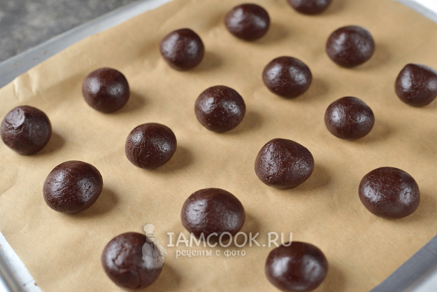 Выстелите противень пекарской бумагой. Наберите неполную столовую ложку теста, скатайте между ладонями шарики, выложите их на противень.