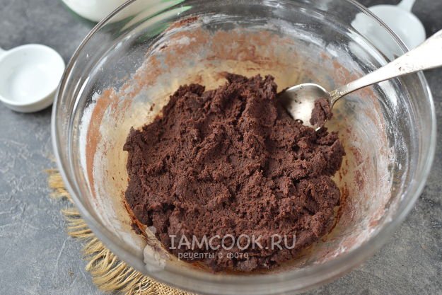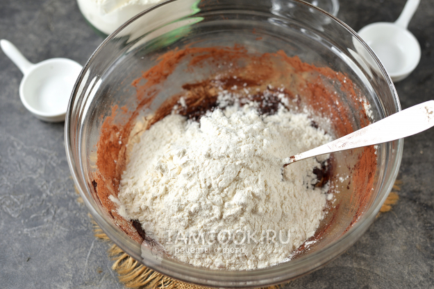 Всыпьте какао-порошок, разрыхлитель и ванильный сахар, чуть размешайте.