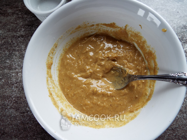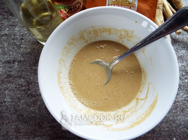 Порошок горчицы залить горячей водой и тщательно перемешать, чтобы не было комочков.