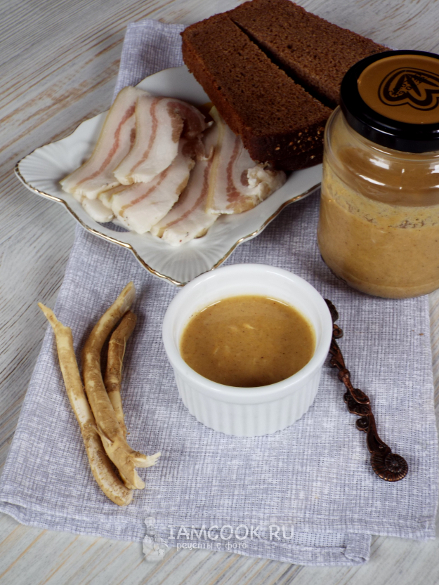 Переложить хрен в горчицу. Добавить остальные ингредиенты.