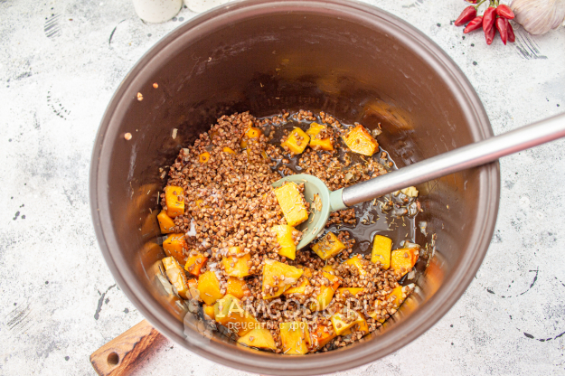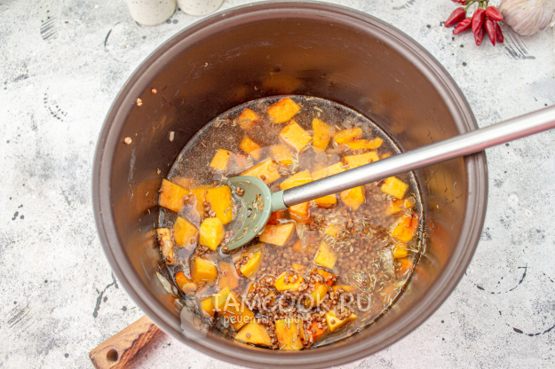 Влейте воду, добавьте соль и перец. Установите режим "Каша" и готовьте гречку с тыквой в мультиварке до сигнала.
