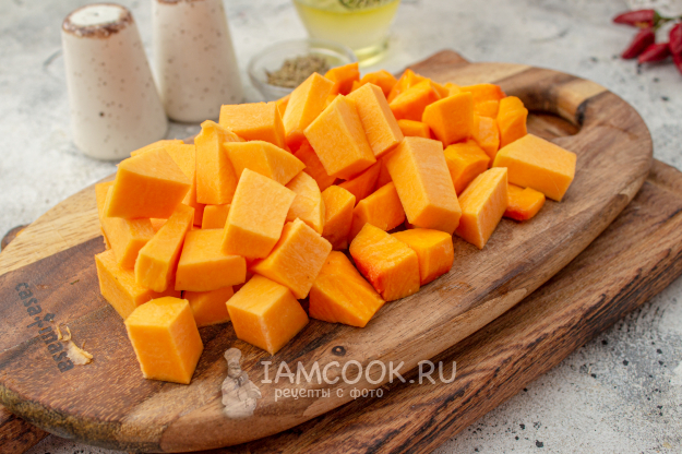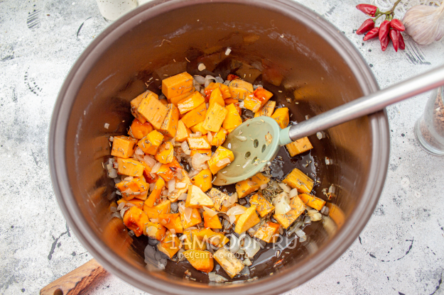 В мультиварку налейте растительное масло, добавьте лук и чеснок. Установите режим "Жарка" на 10 минут. Обжаривайте лук и чеснок 5 минут, добавьте кусочки тыквы и жарьте еще 5 минут. Всыпьте розмарин, перемешайте.