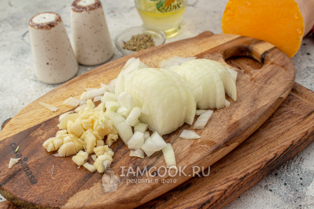 Лук нарежьте мелким кубиком, чеснок мелко порубите.