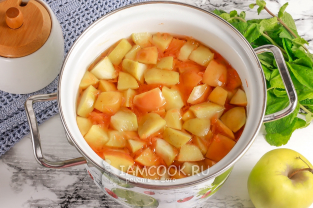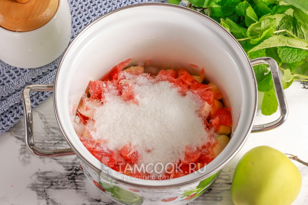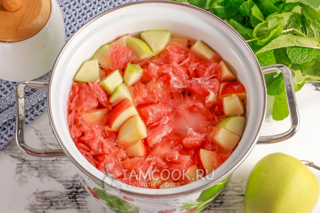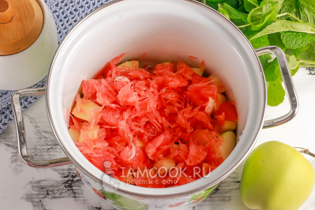 Разрежьте грейпфрут пополам и удалите кожуру, а затем белый слой под ней. Разделите на ломтики и удалите пленку, косточки. Розовую мякоть выложите в кастрюлю к яблочной нарезке. Дольки грейпфрута желательно очистить от пленки, так как она слишком жесткая на вкус.