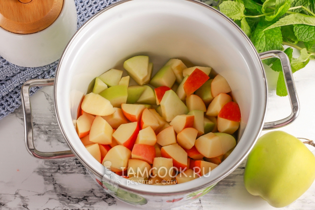 Яблоки промойте в воде, разрежьте на четвертинки и вырежьте из них семенные блоки. Нарежьте мякоть кубиками или ломтиками - по вашему желанию. Всыпьте нарезку в кастрюлю или ковш.
