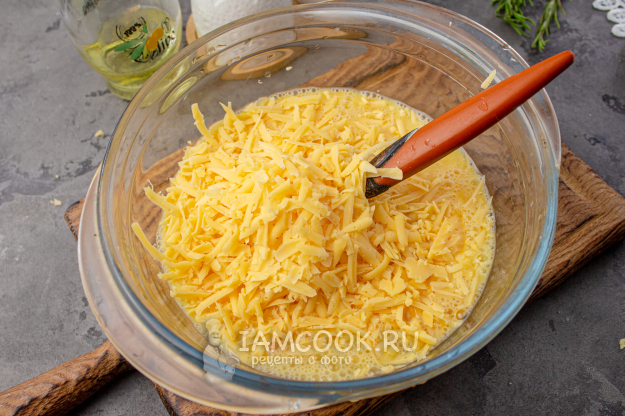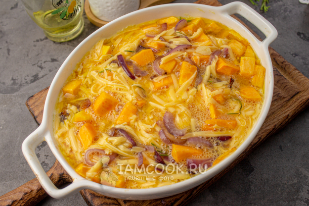 Смешайте с яично-сырной заливкой, приправьте по вкусу. Поставьте в духовку и допекайте при той же температуре еще 20 минут.