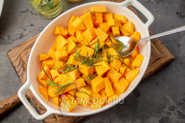 Тыкву очистите и нарежьте средним кубиком, выложите в форму для запекания, посолите и поперчите по вкусу и добавьте веточку розмарина. Влейте 1 столовую ложку оливкового масла и поставьте в заранее разогретую до 190-200 градусов духовку на 10 минут, чтобы она стала немного мягче.
