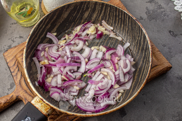 Пока тыква запекается, красный лук нарежьте тонкими перьями, чеснок - тонкими пластинами. Обжарьте овощи до мягкости в сковороде на оставшемся (1 ст.л.) оливковом масле.