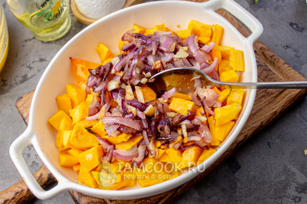 Достаньте из духовки слегка запеченную тыкву и смешайте ее с обжаренными луком и чесноком.