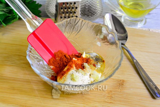 Приготовьте соус: смешайте майонез с горчицей, паприкой, выдавите туда же чеснок и поперчите по вкусу. Перемешайте соус.
