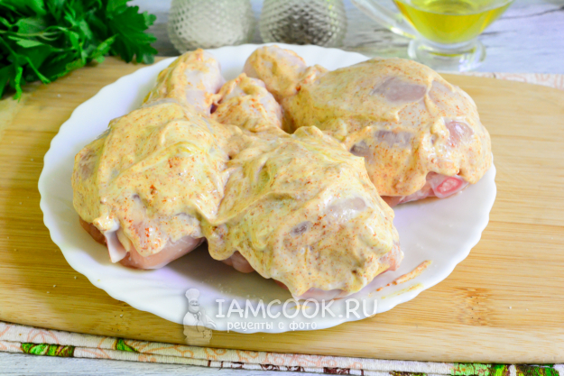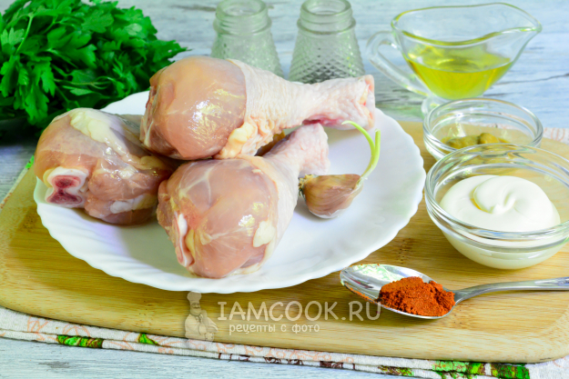 Все необходимые ингредиенты для приготовления куриных ножек в майонезе с чесноком на сковороде - перед вами.