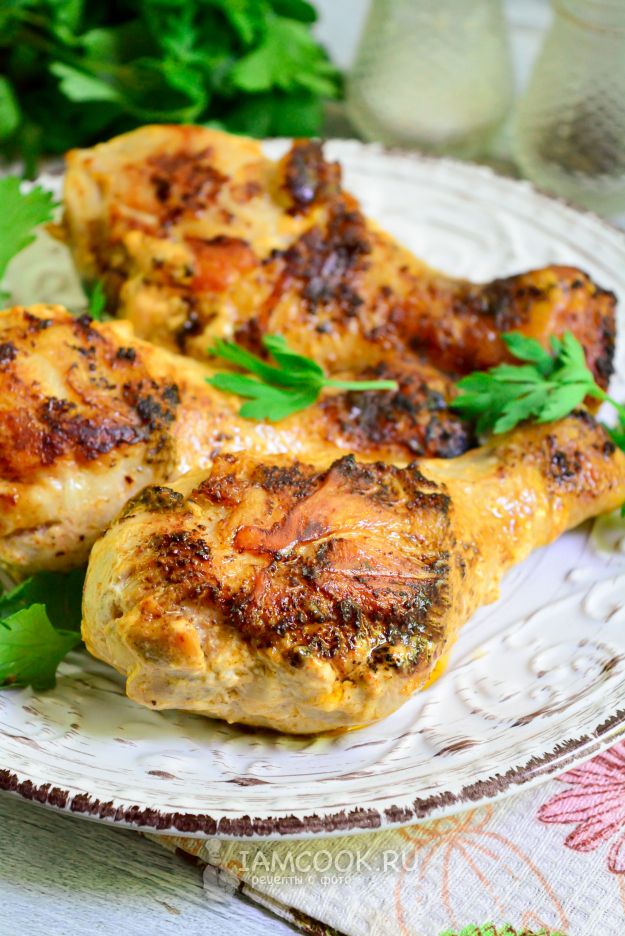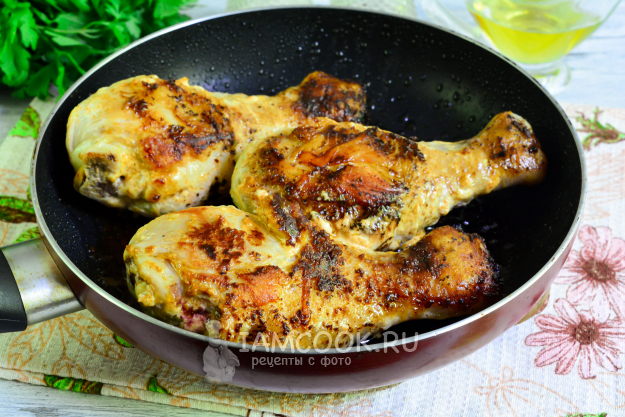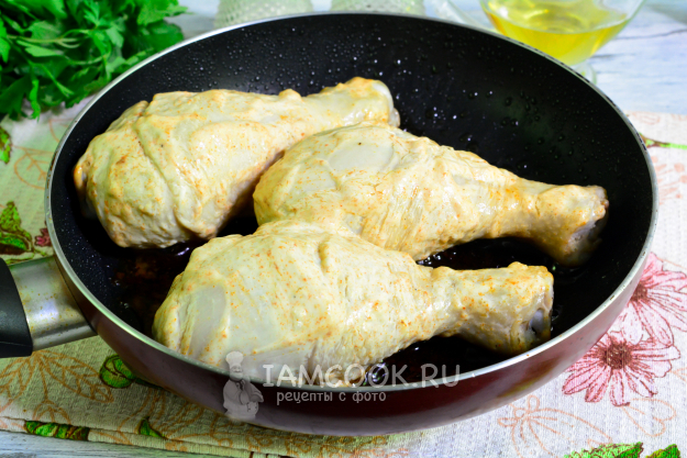 Куриные ножки в майонезе с чесноком быстро жарятся на сковороде и блюдо получается очень вкусным.