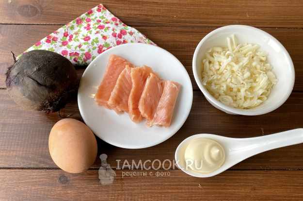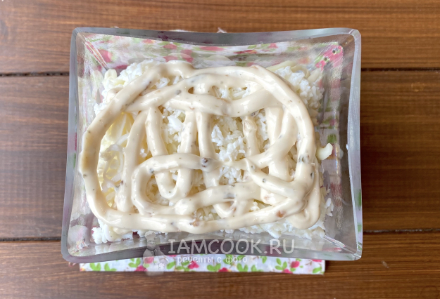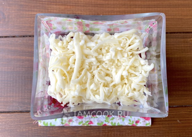 Для начала сварим или запечем свеклу, остудим и натрем на терке. Если свекла слишком сочная, отожмем лишний сок и выложим первым слоем в салатник. Затем слегка смажем майонезом.