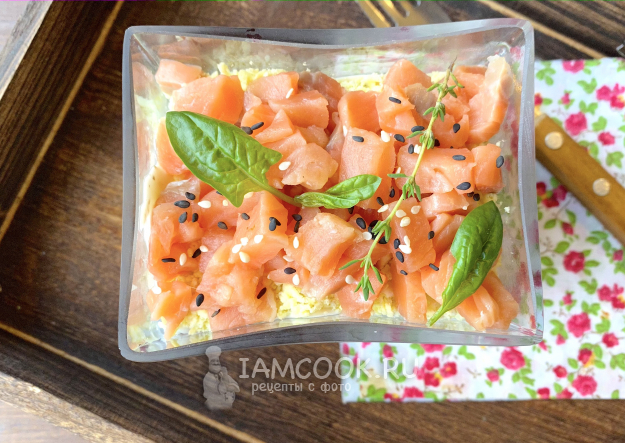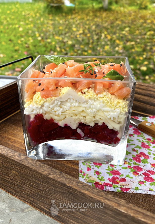 Слои можно класть в любом порядке, я выкладывала по-разному. Но в итоге мне показалось, такой порядок слоев самый идеальный, ведь свекла лежит первым слоем и не может окрасить все остальные продукты, да и рыбка сверху выглядит нарядно.
