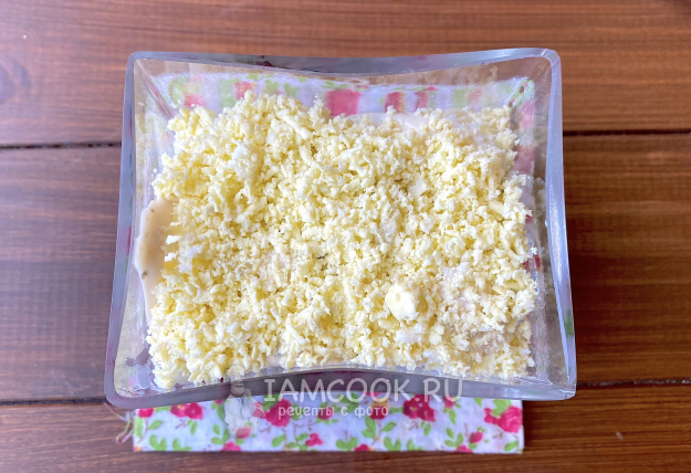 Вареное яйцо нужно очистить и отделить желтки от белков. Белки натрем на терке и выложим на сыр, смажем майонезом.