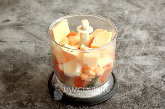 Поместите сыр, морковь, яйцо, укроп в блендер и измельчите.