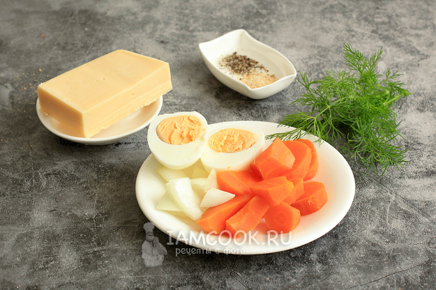 Отварите яйцо и морковь, нарежьте на кусочки, удобные для измельчения в блендере. Репчатый лук и сыр тоже нарежьте.