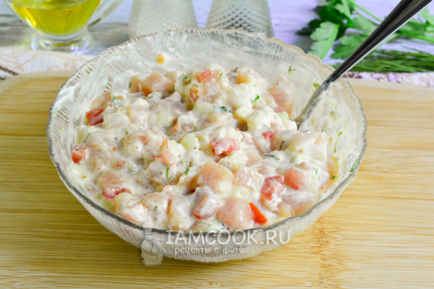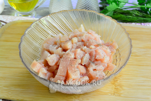 Куриное филе сполосните и вытрите бумажными салфетками насухо. Нарежьте мясо мелкими кубиками. Хорошо, когда филе слегка подморожено - так его удобно будет нарезать. Кубики куриного мяса посолите и поперчите по вкусу.