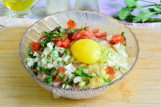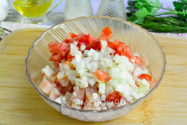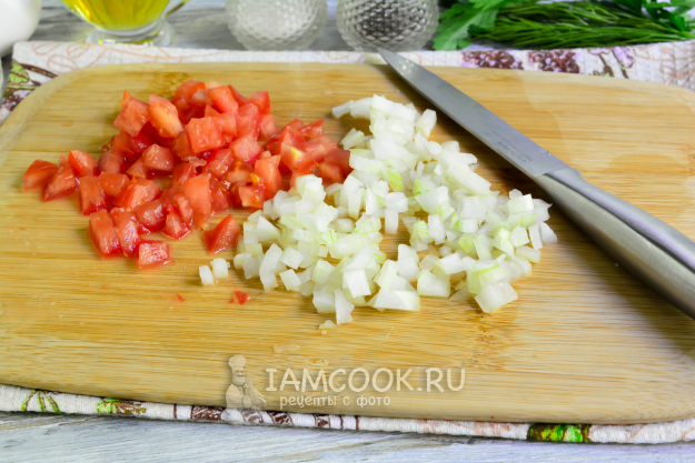Также мелкими кубиками нарежьте помидоры и репчатый лук. Помидоры советую брать мясистые и плотные.