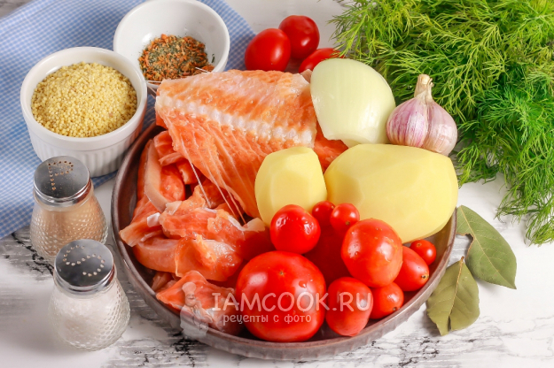 Продукты для приготовления ухи из форели с пшеном и картошкой - перед вами.