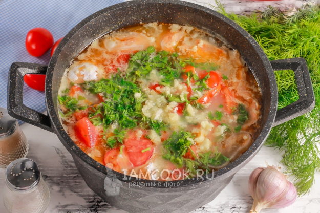 Затем добавьте нарезку промытых помидоров, свежей зелени. Очистите зубчики чеснока, промойте и спрессуйте в емкость. Аккуратно все перемешайте и отварите уху еще 5 минут. Попробуйте блюдо на вкус. Если потребуется, то подкорректируйте его.