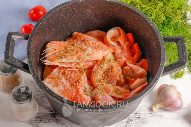Тщательно промойте и очистите от чешуи, пленок части форели, добавьте в казан. Всыпьте соль, молотый черный перец и овощную приправу.