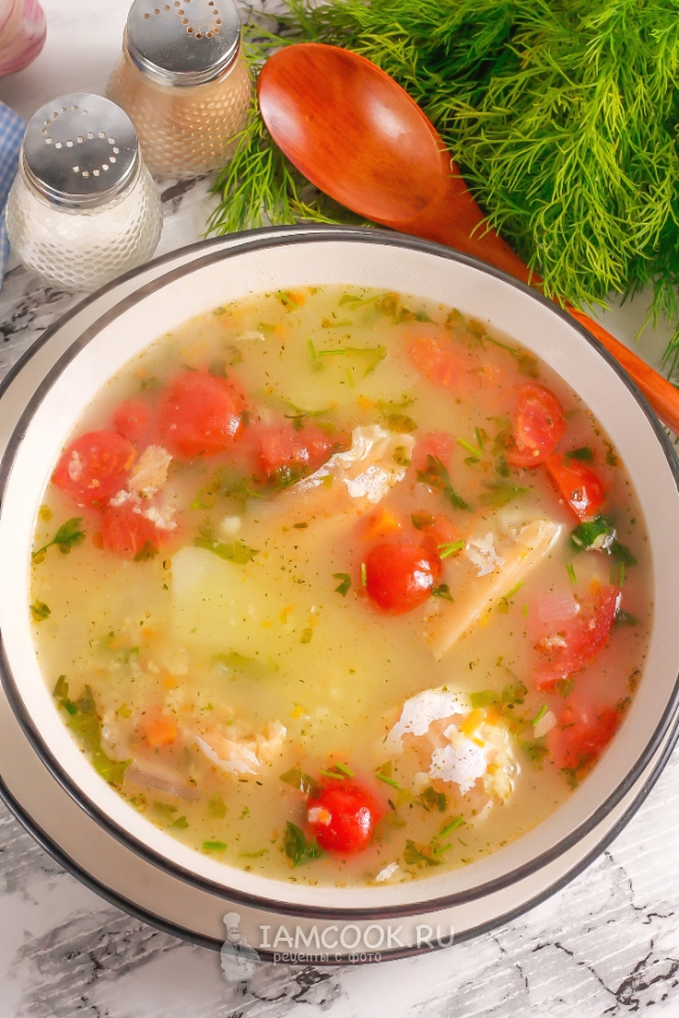 Уха из форели с пшеном и картошкой готова. Разлейте горячее блюдо в глубокие тарелки и подайте к столу. Можно дополнить блюдо чесночным соусом или майонезом, сметаной любой жирности.