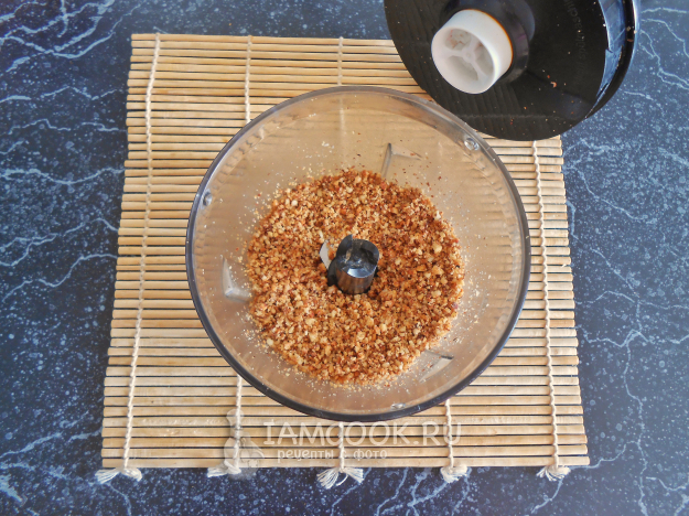 Остывшие грецкие орехи измельчите в крошку с помощью блендера.