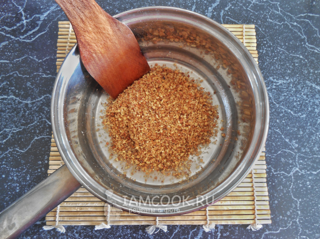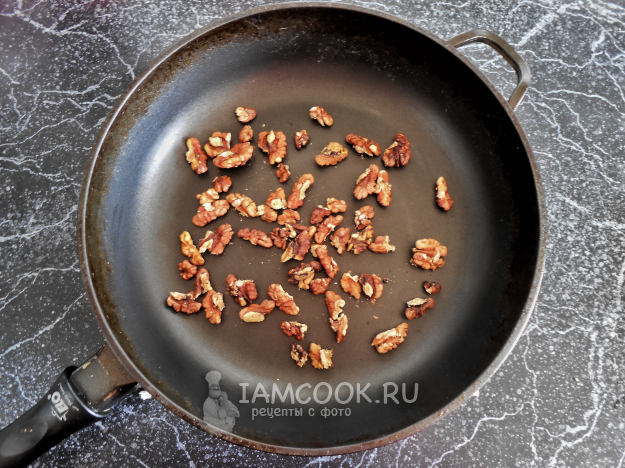 Обжарьте очищенные грецкие орехи на сухой сковороде. Жарьте на медленном огне, помешивая, в течение 6 минут. Остудите.