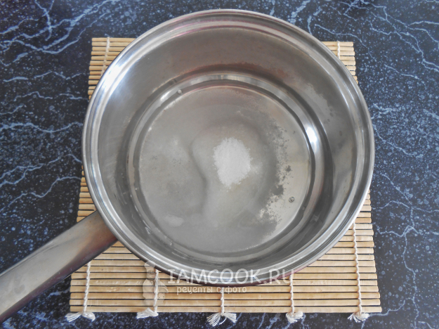 Соедините в сотейнике воду и сахарный песок. На медленном огне доведите до кипения и варите пару минут до загустения.