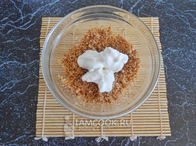 В ореховую массу частями вводите взбитые белки и аккуратно вмешивайте их лопаткой.