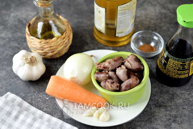 Для приготовления хе из куриных сердечек по-корейски вам понадобятся все продукты на фото. Лук, чеснок и морковь почистите, помойте.