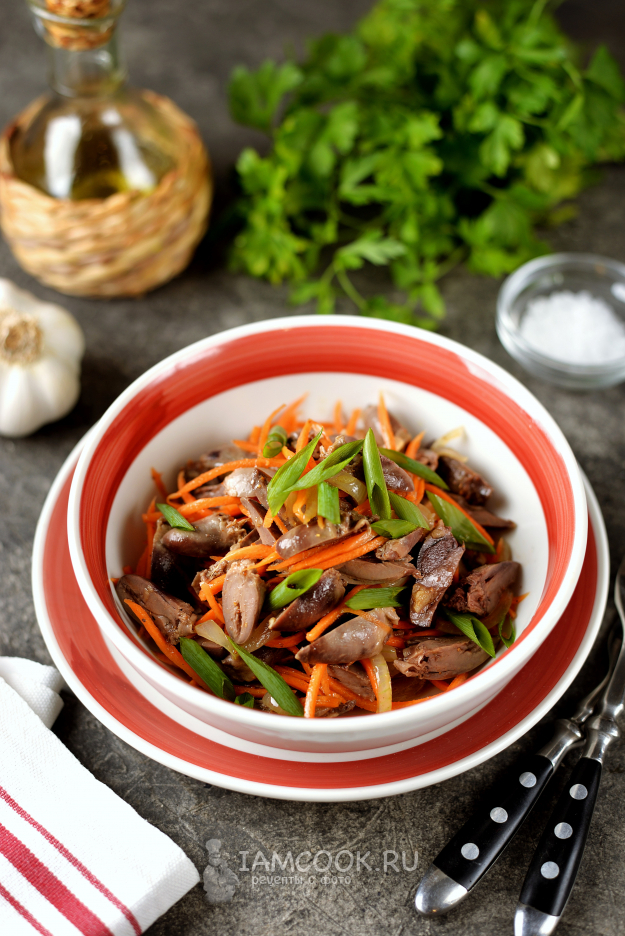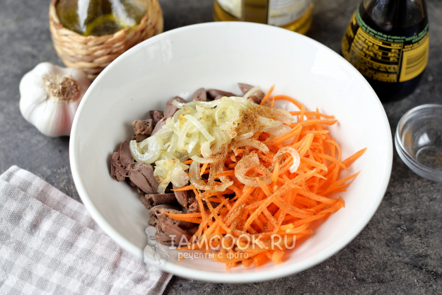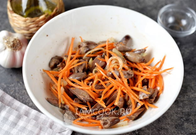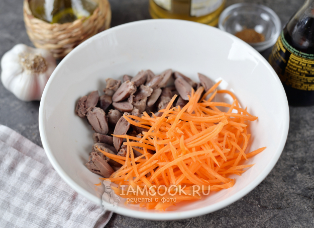 Дальше сердечки нужно остудить и нарезать на четвертинки, а если они мелкие, тогда пополам. Натрите морковь тонкой соломкой, сложите все в глубокую миску.