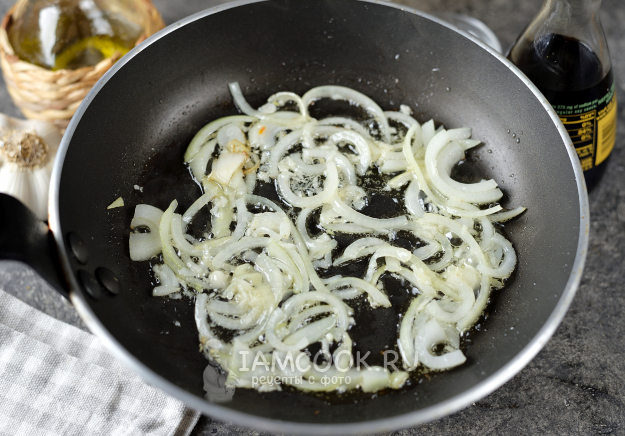 Разогрейте в сковороде растительное масло, быстро обжарьте на нем нарезанный полукольцами репчатый лук и пропущенный через пресс чеснок до мягкости.