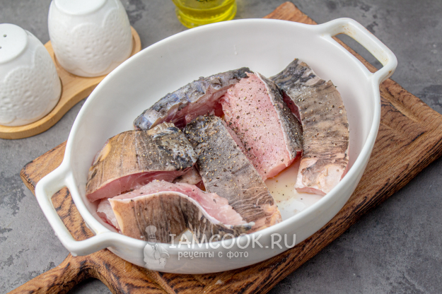 Рыбу очистите максимально от костей, от чешуи и тщательно удалите внутренности. Протрите рыбу бумажными полотенцами насухо. Нарежьте на средние кусочки, сложите в посуду, посолите и поперчите. На этом этапе можете добавить ваши любимые специи. Затем переложите в форму для запекания, смазав ее растительным маслом.
