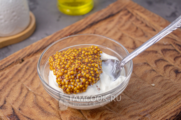 Сметану смешайте с горчицей, солью и черным молотым перцем.