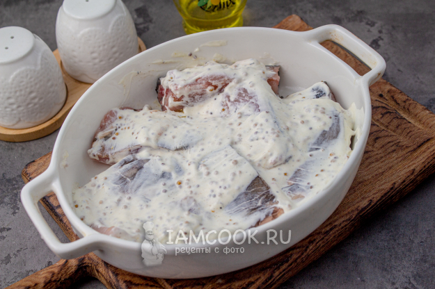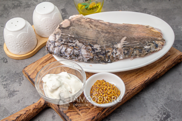 Подготовьте все продукты для запекания карпа кусочками в духовке в сметане. Горчицу можете не добавлять, если не любите, а также по желанию используйте специи для рыбы. Сметану используйте жирностью от 20%.