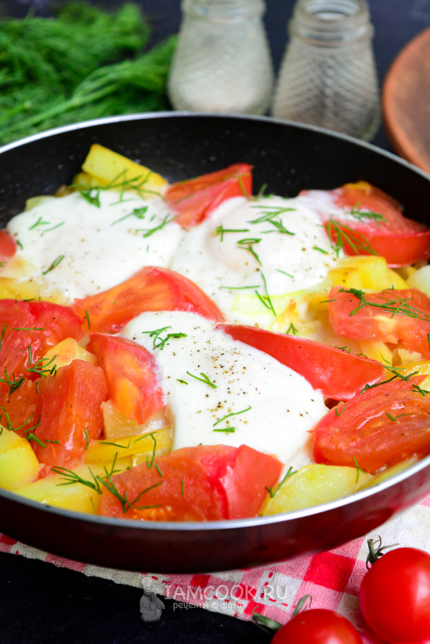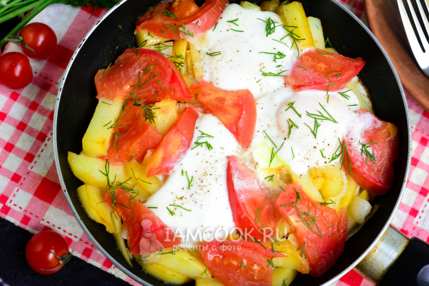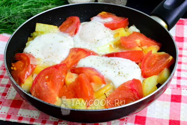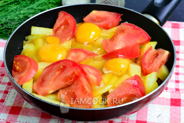 Жарьте 3-4 минуты, до желаемой готовности яиц. Желток можете оставить жидким при желании. Или жарьте картошку с яйцами до полной готовности белков и желтков, как вам больше нравится. Блюдо готово - картофель мягкий и яичница также дошла до кондиции. Помидоры очень сочные и придали легкую томатную кислинку.