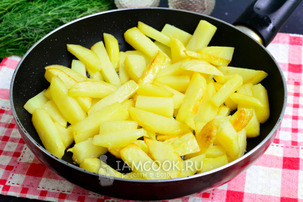 Разогрейте на сковороде два вида масла - сливочное и растительное - так картошка будет вкуснее и ароматнее. Выложите брусочки картошки и начните жарить на среднем огне. Обжаривайте картошку 6-7 минут, пока нижний слой не подрумянится, затем перемешайте картошку и жарьте еще столько же времени.