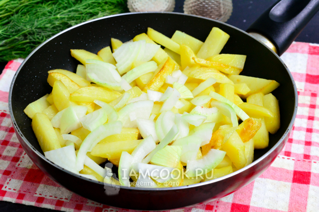 Когда картошка станет наполовину готовой, всыпьте в сковороду лук и обжаривайте все вместе 3-4 минуты, огонь немного убавьте.